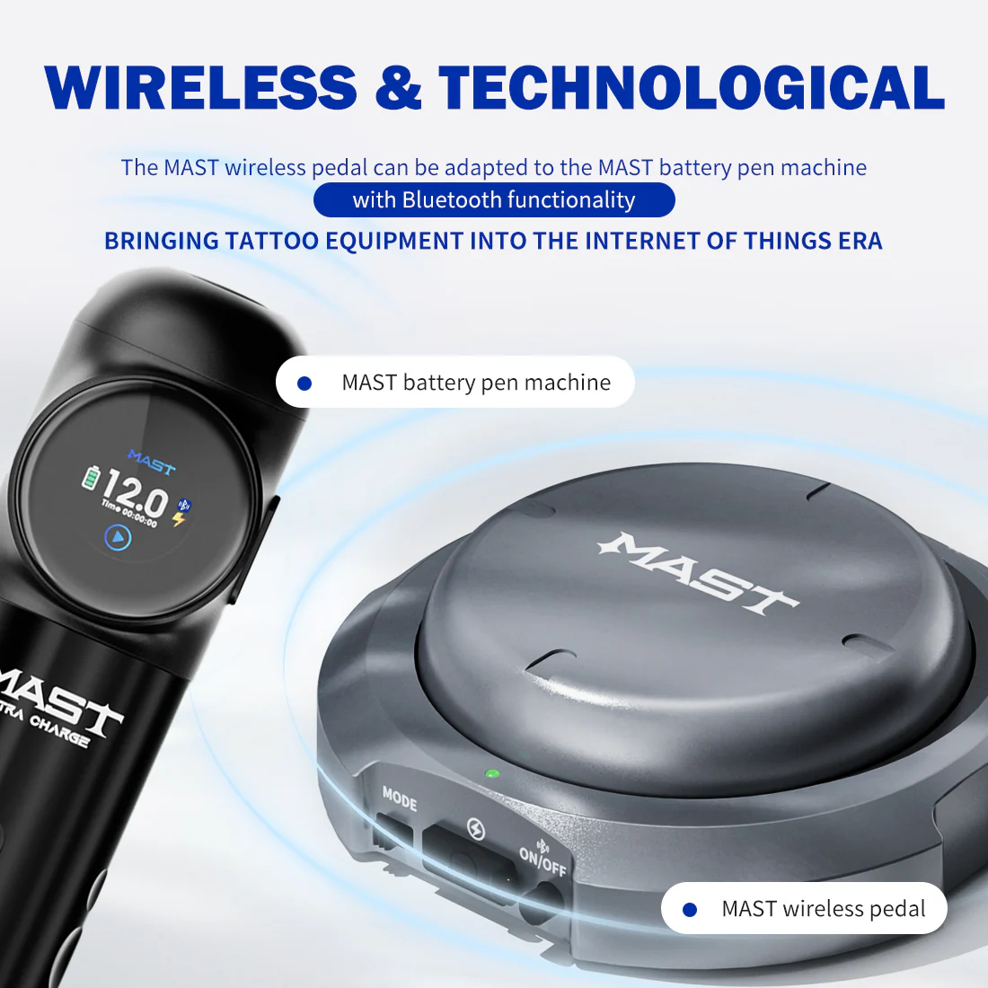 The MAST wireless pedal can be adapted to the MAST battery pen machine with Bluetooth functionality.